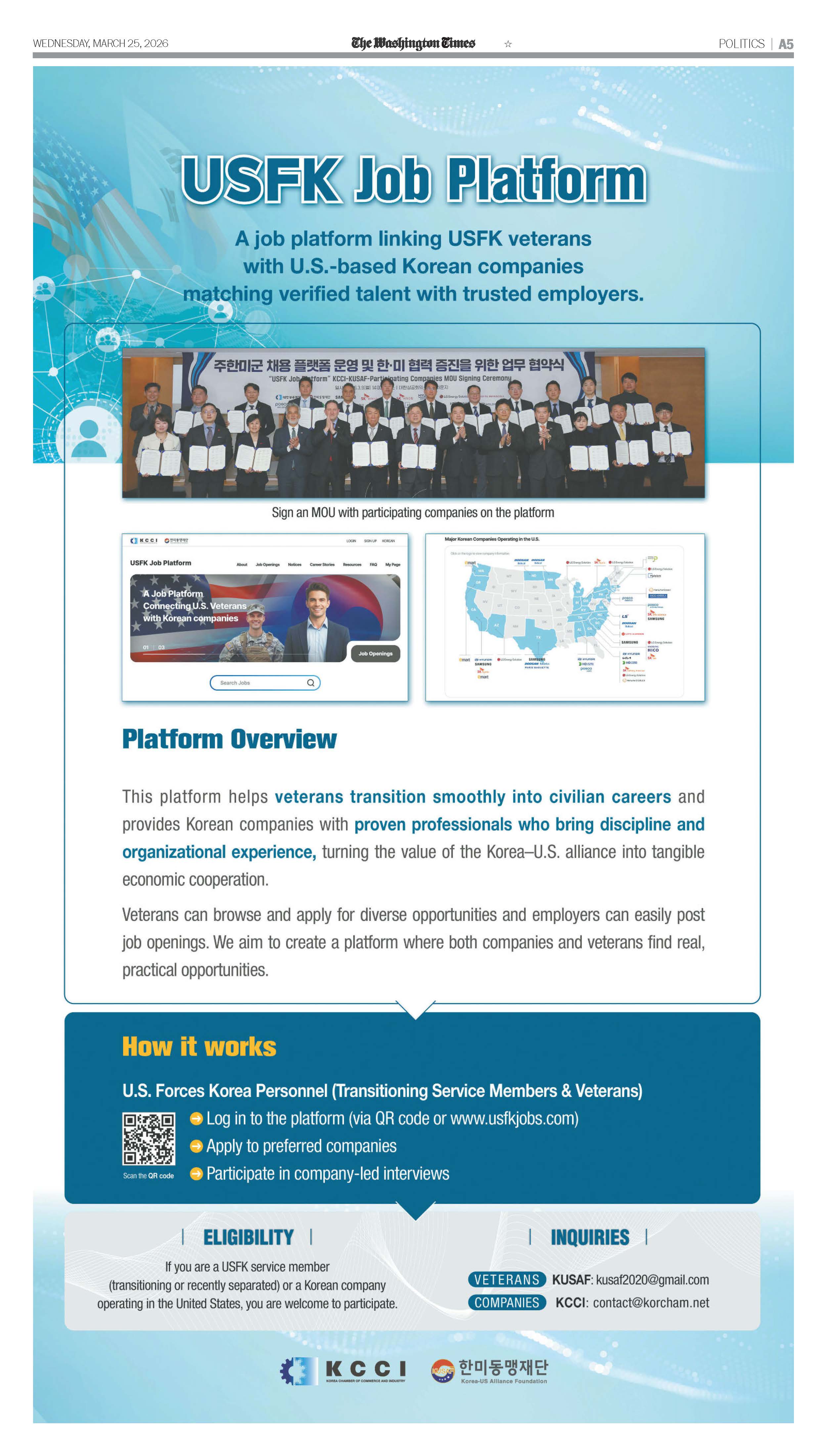 [보도자료] 대한상의 주한미군 전역장병 채용플랫폼, 워싱턴타임즈 전면 광고 게재